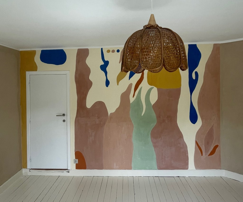 Ici, il s’agit d’une chambre entièrement peinte à base de peinture à la chaux, tant pour la couleur principale que pour la fresque, dont les couleurs ont été composées sur mesure pour cette dernière. Un mélange de peinture à la chaux donc et de pigments pour un résultat qui demande plus d’huile de coudes que d’investissement financier.