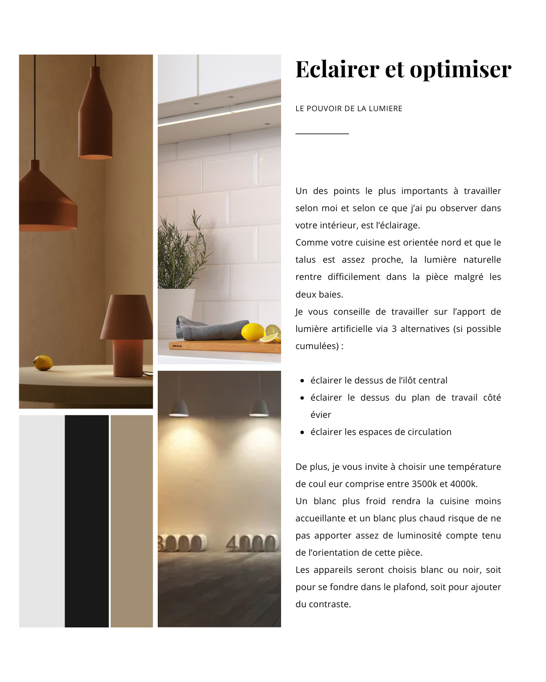 C’est comme ça que j’ai dernièrement aidé une cliente en phase d’acquisition de sa nouvelle cuisine, un peu hésitante sur les choix esthétiques à associer et les éclairages les plus judicieux en fonction de son utilisation personnelle de cet espace si important d’une habitation.